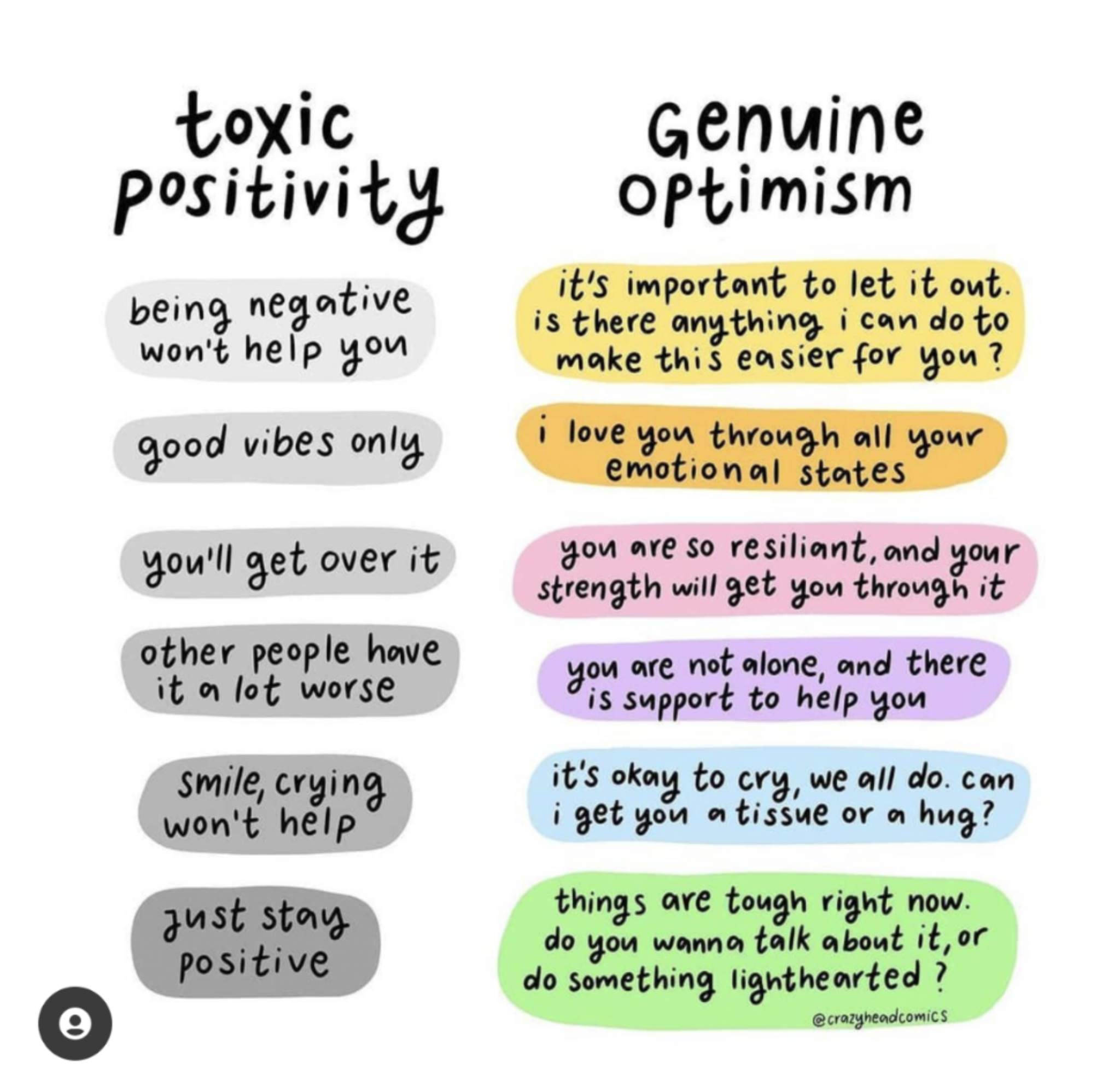 Toxic positivity, di sisi lain, adalah sikap atau pemikiran yang berlebihan dan tidak sehat dalam mempromosikan kebahagiaan dan pemikiran positif, hingga mengabaikan atau menolak emosi negatif atau kesulitan yang mungkin muncul. Orang yang terjebak dalam toxic positivity seringkali merasa terpaksa untuk selalu berpikir positif dan menghindari mengakui atau merasakan emosi yang tidak menyenangkan. Ini bisa mengarah pada penekanan emosi yang sebenarnya, penolakan terhadap pengalaman negatif orang lain, atau bahkan mengabaikan masalah serius yang membutuhkan perhatian.